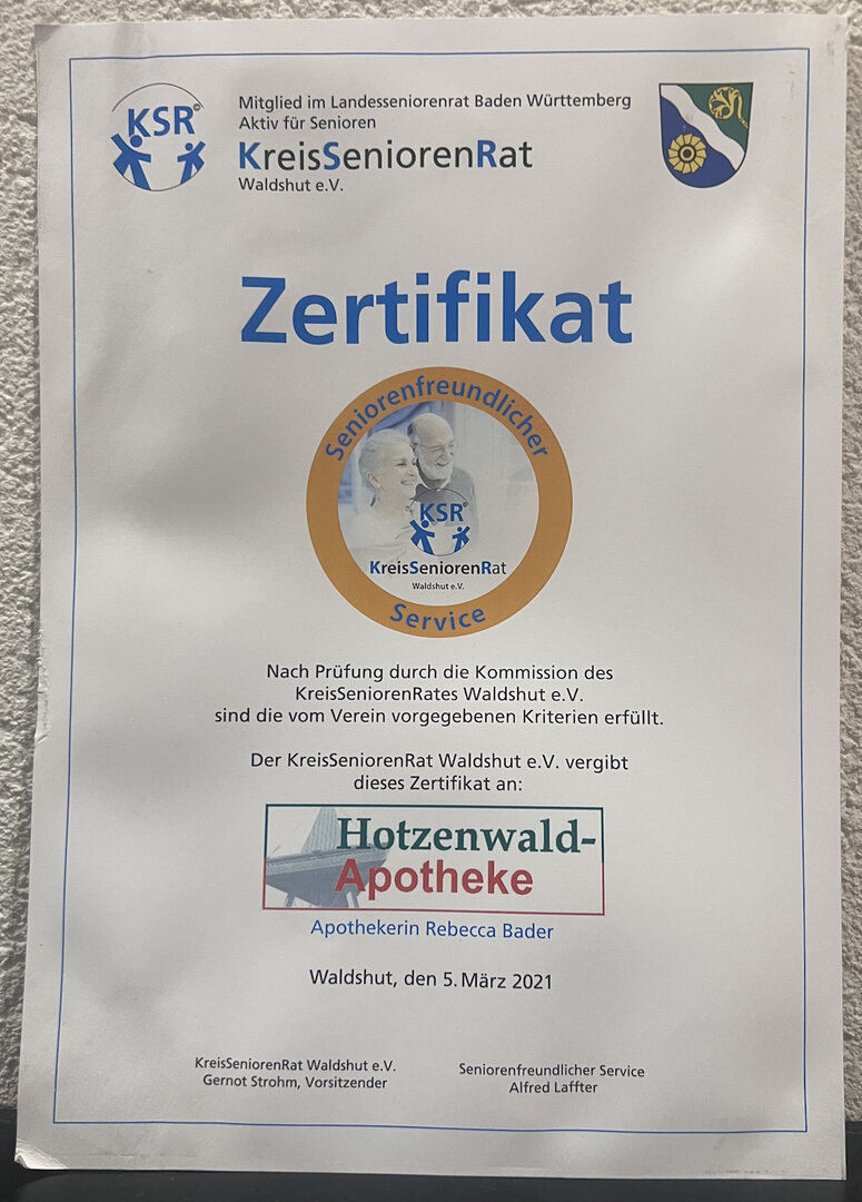 "Seniorenzertifiziert" ist bei uns nicht nur ein Wort, sondern Qualitätsstufe, die uns auszeichnet: so etwa der Barierefreie Zugang ohne Treppen, genügend Parkplätze vor Ort, Sitzgecke mit frischem Trinkwasser, individuelle Beratung, Heimlieferservice, Herstellung eigener Rezepturen u.v.m.